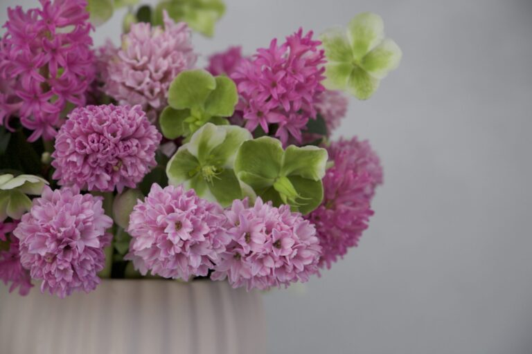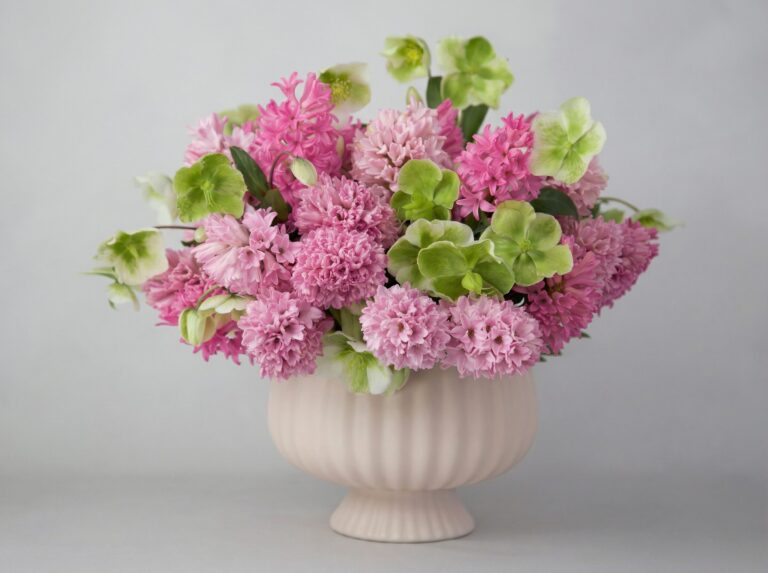 Fresh and fragrant, pink hyacinth and green hellebore form a garden-inspired composition. The blooms perfume the room with soft, lingering fragrance. Presented in a ceramic pedestal vase.